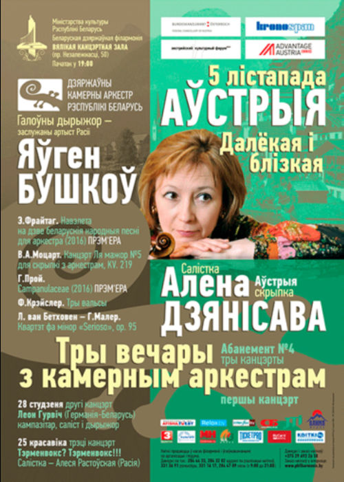 "Три вечера с камерным оркестром" Государственный камерный оркестр Республики Беларусь Главный дирижер - заслуженный артист России Евгений Бушков - "Австрия - далекая и близкая" Э.Фрайтаг. "Новелетта" на две белорусские народные песни для оркестра В.А.Моцарт. Концерт Ля мажор №5 для скрипки с оркестром, KV. 219 Г. Прой. «Campanula» Ф.Крейслер. три вальсы Л.ван Бетховен-Г.Малер. Квартет фа минор "Serioso", ор. 95 Солистка - Елена Денисова (скрипка, Австрия)