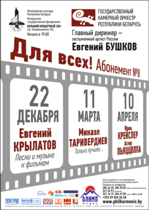 Add to calendar"Для всех" Абонемент № 8 (три концерта) Государственный камерный оркестр Республики Беларусь Главный дирижер - заслуженный артист России Евгений Бушков -Микаэл Таривердиев. Только лучшее ... -Евгений Крылатов. Песни и музыка к кинофильмам -Ф.Крейслер И А.Пьяццолла Концерты состоятся: 22 декабря, 11 марта, 10 апреля Начало-19:00