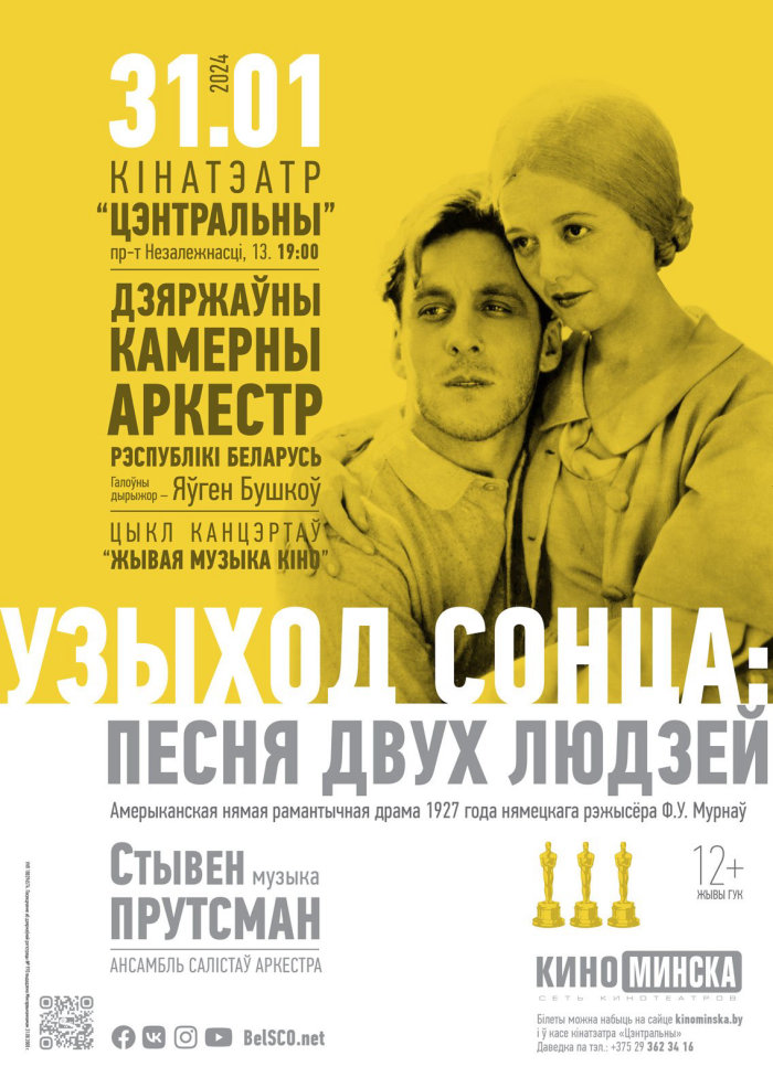 Коллекция немых фильмов полюбившегося публике проекта Государственного камерного оркестра «Живая музыка кино» пополнилась очередным шедевром! На этот раз известный американский композитор Стивен Прутсман написал музыку к оскароносному голливудскому фильму «Восход солнца: песня двух людей» (1927) - классика немецкого кино Фридриха Мурнау. Эта романтическая драма была признана величайшим из всех немых фильмов по итогам самого масштабного в истории опроса кинокритиков, который состоялся в 2012 году. Ансамбль солистов Государственного камерного оркестра, в сопровождении которого состоится показ фильма, с нетерпением ждёт встречи со зрителями, чтобы исполнить, захватывающую, необычайно тонко дополняющую содержание кадра музыку Стивена Прустмана. Билеты можно приобрести на сайте https://kinominska.by/ а также в кассе кинотеатра «Центральный»Add to calendar